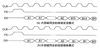 同步串行口有連續(xù)及突發(fā)兩種操作模式,可支持一系列應(yīng)用。在連續(xù)模式下,只需要一個(gè)幀同步脈沖就可以連續(xù)發(fā)送或接收多個(gè)軟件包?在突發(fā)模式下,在每一個(gè)幀同步脈沖之后只允許發(fā)送或接收一個(gè)16bit單字。具有內(nèi)部幀同步的連續(xù)發(fā)送時(shí)序和具有外部幀同步的連續(xù)接收時(shí)序分別如圖1a和圖1b所示。