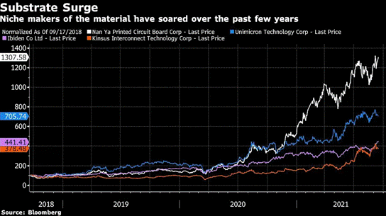 截至周三的過去三年中,在中國臺灣市場上市的南亞電路板已累計上漲了1219%,分析師預計其未來還將進一步走高。其他ABF載板主要生產(chǎn)商欣興電子(Uniimicron Technology)、景碩科技(Kinsus Interconnect Technology)和Ibiden等也都出現(xiàn)了飆升。