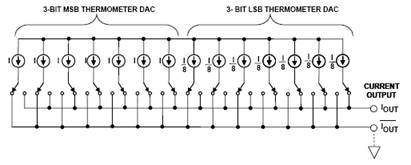 圖4:基于兩個3位溫度計DAC的6位電流輸出分段DAC