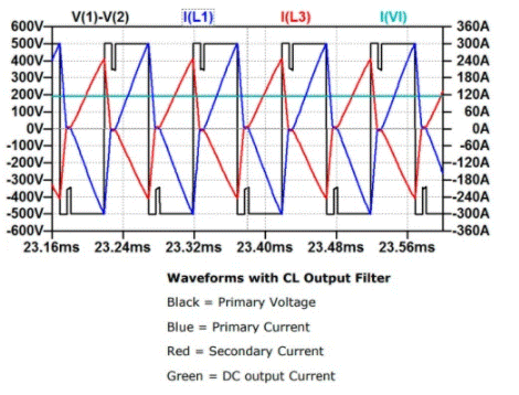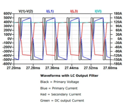 這是本質(zhì)上是隔離的單向轉(zhuǎn)換器。它的初級(jí)繞組借助于單相H橋逆變器來驅(qū)動(dòng)。直流輸出是通過全橋整流器產(chǎn)生的,并且為了直流輸出的清潔度需要一個(gè)輸出濾波器,可以是CL或LC。帶有LC和CL濾波器的DC-DC轉(zhuǎn)換器如圖1所示。在CL濾波器的情況下,不需要整流二極管來整流二極管。由于整流器電流不連續(xù),H橋中的電流波形為三角形。較高的電流峰值導(dǎo)致三角波形效率低下。如圖2所示,在400直流輸出和500直流輸入下有120A電流充電。使用LC輸出濾波器會(huì)產(chǎn)生連續(xù)電流,該連續(xù)電流會(huì)在H橋中產(chǎn)生具有低電流峰值的方波。與使用LC濾波器有關(guān)的另一個(gè)優(yōu)勢(shì)是效率高[1]。LC濾波器的波形如圖3所示。