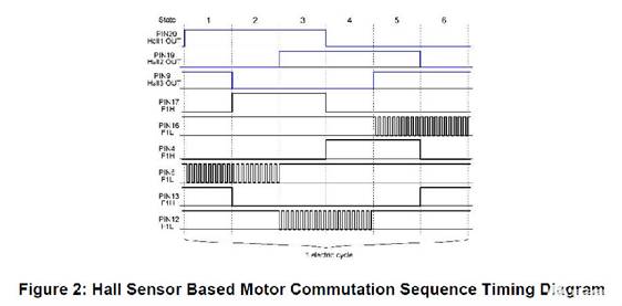 BLDC 電機定子由疊層鋼制成,用于承載繞組。定子中的繞組可以按兩種模式排列 - 星形圖案 (Y) 或三角形圖案 (Δ)。兩種模式之間的主要區(qū)別在于 Y 模式在低 RPM 時提供高扭矩,而 ? 模式在低 RPM 時提供低扭矩。這是因為在 ? 配置中,一半的電壓施加在未驅(qū)動的繞組上,從而增加了損耗,進而增加了效率和扭矩。BLDC 電機使用電氣循環(huán)進行控制。一個電循環(huán)有 6 個狀態(tài);诨魻杺鞲衅鞯碾姍C換向序列如圖 2 所示。