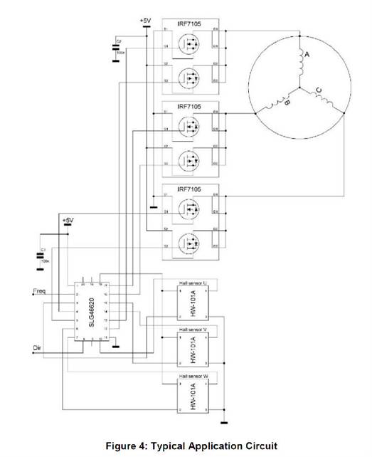 該項目描述了如何使用SLG46620 GreenPAK IC和霍爾效應(yīng)傳感器控制三相無刷直流電機。SLG46620 還包含可用于該項目的其他功能。例如,GreenPAK 中的 ADC 可以解釋輸入直流電壓并根據(jù)該值生成 PWM 脈沖,而不是使用輸入頻率。