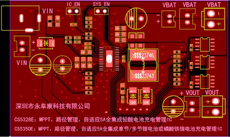 深圳市永阜康科技有限公司針對太陽能的應用市場,推廣具有太陽能板最大功率點跟蹤(MPPT)功能的鉛酸電池、磷酸鐵鋰,鋰電充電管理IC系列-CS5328E/CS5350E。最大程度利用太陽能板即時所吸收轉換的能量給電池充電,最大充電電流可設置為5A。