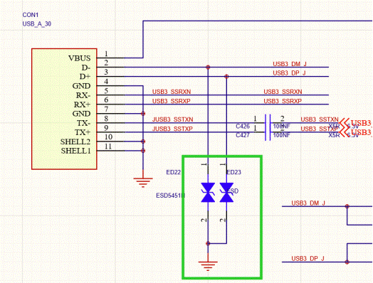 如上圖是我們在電路中最常見的處理靜電的防護(hù)電路,給接口器件添加esd進(jìn)行接地。