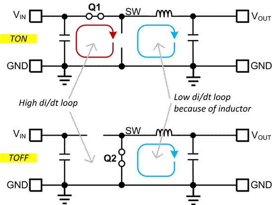圖 1.降壓轉(zhuǎn)換器中的電流環(huán)路。VIN環(huán)路為高 di/dt環(huán)路。