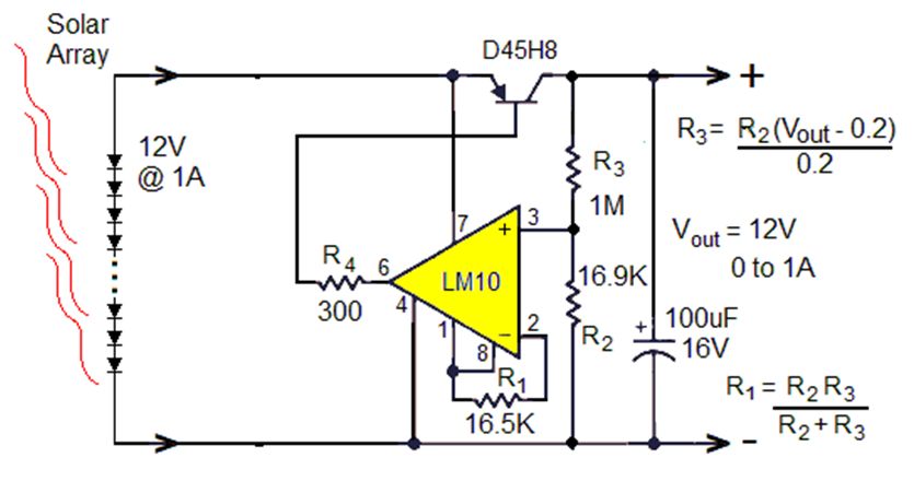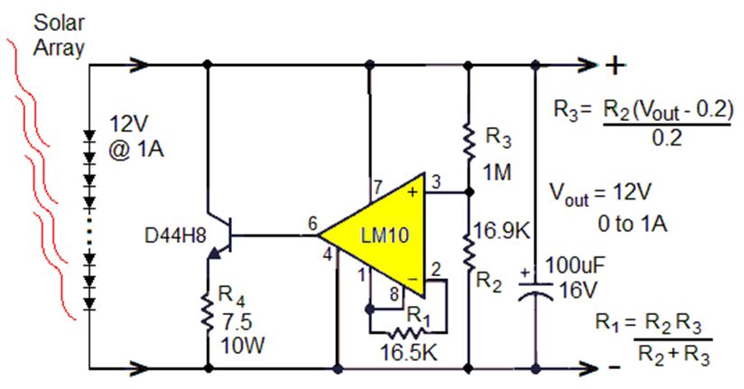 讓我們從一個(gè)假設(shè)的小型太陽(yáng)能電池陣列開始,該陣列針對(duì) 12W 輸出(在完全陽(yáng)光直射下 ~1kW/m 2)、1A 和 12V、20% 的光電轉(zhuǎn)換效率進(jìn)行了優(yōu)化,因此標(biāo)稱面積為 ~0.06m 2 = ~ 100 英寸2 . 然后添加線性調(diào)節(jié)電路,以在負(fù)載電流從 0 到 1A 變化時(shí)保持恒定的 12V 輸出。