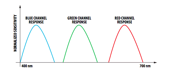 各個紅色,綠色和藍色通道的光譜響應應重疊,以確保捕獲所有波長信息。下面的圖1和圖2分別顯示了重疊和不重疊的頻譜響應。圖3顯示了從藍色表面反射的信號的任意光譜。 |