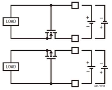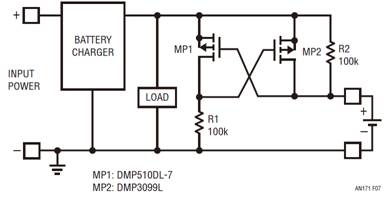 處理電源電壓反轉(zhuǎn)有幾種眾所周知的方法。最明顯的方法是在電源和負(fù)載之間連接一個二極管,但是由于二極管正向電壓的原因,這種做法會產(chǎn)生額外的功耗。雖然該方法很簡潔,但是二極管在便攜式或備份應(yīng)用中是不起作用的,因為電池在充電時必須吸收電流,而在不充電時則須供應(yīng)電流。