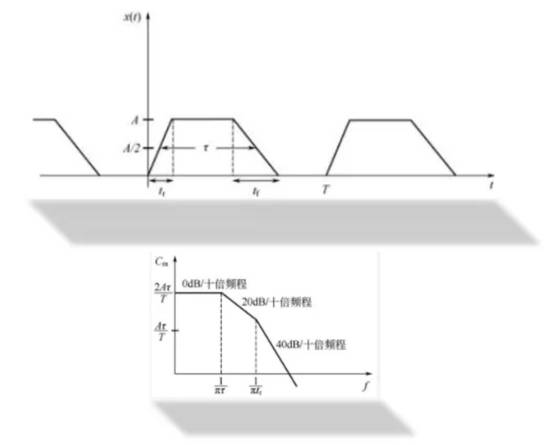 下圖為梯形脈沖波形的時(shí)域波形和頻譜包絡(luò)線;A=幅度,tr=上升沿時(shí)間,τ=平均寬度。從圖中可以看出上升時(shí)間對(duì)于高頻諧波存在的影響?梢(jiàn)在EMC設(shè)計(jì)中,著重關(guān)注快速上升沿信號(hào)是有充分的理由的,而且?guī)缀跛嘘P(guān)于干擾發(fā)射的測(cè)試中,快速上升沿信號(hào),都是最主要因素。那是否只需要處理這類信號(hào)就行了呢。由于EMC測(cè)試中還有抗擾度項(xiàng)目,所以對(duì)慢速信號(hào)的處理也需要處理。