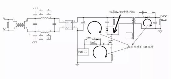 由1-1和1-2式可知,寄生電感和di/dt形成電壓尖峰,寄生電容和dv/dt形成電流尖峰。這些快速變化的電流和關(guān)聯(lián)的諧波在其他地方產(chǎn)生耦合的噪聲電壓,因此影響到開(kāi)關(guān)電源EMI特性。下面以反激式開(kāi)關(guān)拓?fù)錇槔瑢?duì)降低MOSFET的dv/dt和di/dt措施進(jìn)行介紹。