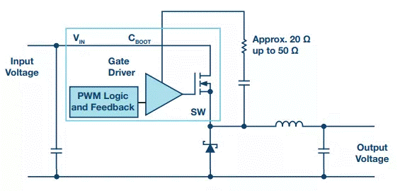 圖2:使用自舉電阻減慢異步降壓轉(zhuǎn)換器中的開關(guān)轉(zhuǎn)換