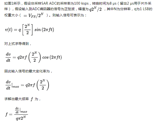 非采樣ADC的一個缺點是,如果在A-to-D的轉(zhuǎn)換期間內(nèi),輸入信號變化超過了1 LSB ,則輸出數(shù)字碼會出現(xiàn)較大的誤差,多數(shù)ADC或多或少都會遇到這樣的問題。下面通過一個簡單計算來說明非采樣ADC的輸入頻率限制。