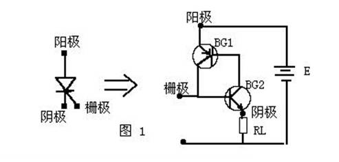 我們可以把從陰極向上數(shù)的、二、三層看面是一只NPN型號(hào)晶體管,而二、三、四層組成另一只PNP型晶體管。其中第二、第三層為兩管交迭共用?僧(huà)出圖1的等效電路圖。當(dāng)在陽(yáng)極和陰極之間加上一個(gè)正向電壓E,又在控制極G和陰極C之間(相當(dāng)BG2的基一射間)輸入一個(gè)正的觸發(fā)信號(hào),BG2將產(chǎn)生基極電流Ib2,經(jīng)放大,BG2將有一個(gè)放大了β2 倍的集電極電流IC2 。因?yàn)锽G2集電極與BG1基極相連,IC2又是BG1 的基極電流Ib1 。BG1又把Ib1(Ib2)放大了β1的集電極電流IC1送回BG2的基極放大。如此循環(huán)放大,直到BG1、BG2完全導(dǎo)通。事實(shí)上這一過(guò)程是“一觸即發(fā)”的,對(duì)可控硅來(lái)說(shuō),觸發(fā)信號(hào)加到控制極,可控硅立即導(dǎo)通。導(dǎo)通的時(shí)間主要決定于可控硅的性能。
