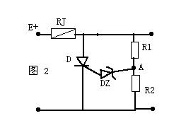 如圖2是一個(gè)電視機(jī)常用的過(guò)壓保護(hù)電路,當(dāng)E 電壓過(guò)高時(shí)A點(diǎn)電壓也變高,當(dāng)它高于穩(wěn)壓管DZ的穩(wěn)壓值時(shí)DZ道通,可控硅D受觸發(fā)而道通將E 短路,使保險(xiǎn)絲RJ熔斷,從而起到過(guò)壓保護(hù)的作用。