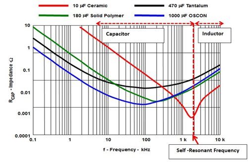 我們可以使用電容組合使阻抗曲線“變平”,以在推高降壓轉(zhuǎn)換器的開關(guān)頻率的同時(shí),使其仍處于電容區(qū)域內(nèi)。電容阻抗因技術(shù)和開關(guān)頻率而異。
