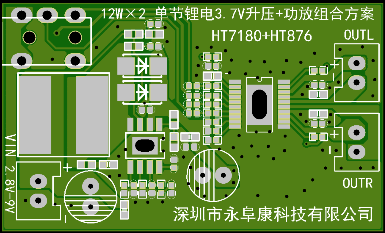 深圳市永阜康科技有限公司推出基于HT876+HT7180的單節(jié)鋰電池3.7V升壓至9.5V、2x12W立體聲升壓音頻放大組合解決方案,無需外圍MOS管、升壓效率最高達90%,外圍簡單、應用方便。