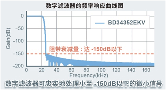“BD34352EKV”作為DAC芯片,不僅性能參數(shù)表現(xiàn)出色(SN比:126dB,THD+N:-112dB),還提升了難以通過參數(shù)體現(xiàn)出來的音質(zhì)性能。例如,在電流段構(gòu)成的“D/A轉(zhuǎn)換電路”中,充分利用了“BD34301EKV”的電路技術(shù),重新對輸出電流量進行了調(diào)整。此外,經(jīng)過精心設(shè)計,通過“數(shù)字信號處理電路”的主要功能--數(shù)字濾波器(FIR濾波器),即使是微小的信號也可以得到忠實地處理,并且阻帶衰減量(數(shù)字濾波器的性能指標之一)達到-150dB以下。因此,新產(chǎn)品可以充分提取音源中的信息,實現(xiàn)了讓人感受到“聲音更強有力、更自然而平穩(wěn)”的音質(zhì)性能。