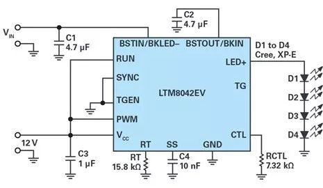 圖1. LTM8042驅動四個LED,其中 VIN = 5.75 V 至 10.25 V and IOUT = 0.5 A