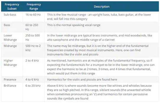 下表列出了 20 Hz 至 20,000 Hz 頻譜內(nèi)的七個(gè)頻率子集,這有助于定義音頻系統(tǒng)設(shè)計(jì)中使用的目標(biāo)范圍。