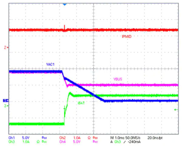 使用備用模式時,充電器會不斷監(jiān)測 VBUS 電壓。當(dāng) VBUS 下降到閾值水平以下時(表明失去了來自適配器的輸入),充電器會迅速從充電模式轉(zhuǎn)變?yōu)?OTG 模式,從電池放電,調(diào)節(jié) VBUS 電壓,并進(jìn)行 FRS,而不需要額外的 DC-DC 轉(zhuǎn)換器。在 BQ25792 中用備用電源模式實現(xiàn) FRS,可以確保任何連接到 PMID 引腳的配件在 VBUS 電壓下降時不會失去電源(圖 3)。