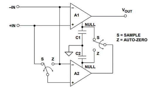 在此,A1是主放大器,其中輸入信號(hào)始終連接到輸出,而A2執(zhí)行歸零自動(dòng)歸零放大器功能。