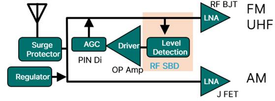 一個(gè)典型的AM/FM RF前端電路(圖2)含多個(gè)分立半導(dǎo)體,用于低噪聲放大器(LNA)、自動(dòng)增益控制(AGC)、穩(wěn)壓和靜電放電(ESD)保護(hù)功能。安森美(onsemi)的符合車規(guī)的寬廣產(chǎn)品組合提供了整個(gè)塊中所需要的所有器件。NSVJ3557SA3和NSVJ3910SB3高壓結(jié)場(chǎng)效應(yīng)晶體管(JFET)提供強(qiáng)固的AM LNA方案,使5 V驅(qū)動(dòng)器實(shí)現(xiàn)9.5 dB的功率增益。