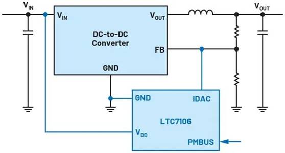 圖2顯示了一個(gè)電路實(shí)例,其中包含一個(gè)未明確指定的電壓轉(zhuǎn)換器,LTC7106DAC插入反饋路徑的接線中。原則上,任何帶有外部可接觸反饋引腳的電壓轉(zhuǎn)換器都可以這樣運(yùn)行。