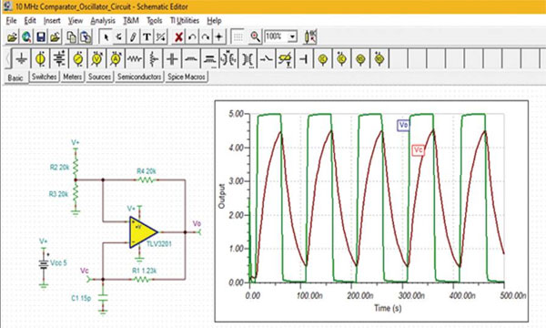 最大振蕩頻率受比較器傳播延遲的限制。本例中,采用具有 40 ns 傳播延遲的 Texas Instruments TLV3201 用于構(gòu)建 10 MHz 振蕩器。該頻率非常接近該比較器的最大值。