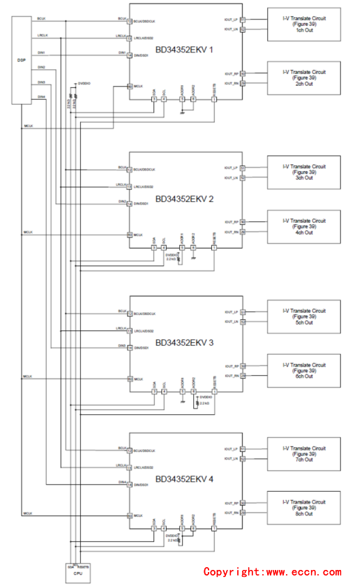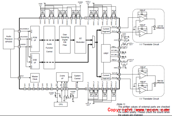Rohm公司的BD34352EKV是32位高音質立體聲D/A轉換器(DAC),取樣頻率768 kHz,具有ROHM原聲質量設計,具有極好的數字性能(SNR為126dB, THD+N為-112 dB(典型值)),適合于高端音頻設備. 最喜歡的聲音是由切換兩種數字FIR濾波器來選擇(快速滾降, 慢速滾降).PCM I/F 支持高達768 kHz和DSD I/F支持高達22.4 MHz. 器件支持立體聲模式(2路)和單聲道模式(1路),可選擇4種器件尋址(38h, 3Ah, 3Ch, 3Eh). AVCC電壓范圍為4.5V到5.5V,DVDD電壓范圍為1.4V到1.6V, DVDDIO電壓范圍為 3.0 V到 3.6 V,動態(tài)范圍為126dB.工作溫度為-25 °C 到 +85 °C.主要用在CD/SACD播放器,數字音頻播放器(DAP)和USB-DAC與其它.本文介紹了BD34352EKV主要特性和主要指標,框圖和典型應用電路, 測量電路圖,兩路立體聲電路圖,四路輸出和八路輸出應用電路,以及評估板BD34352EKV-EVK-001特性和框圖,電路圖,材料清單和PCB設計圖.