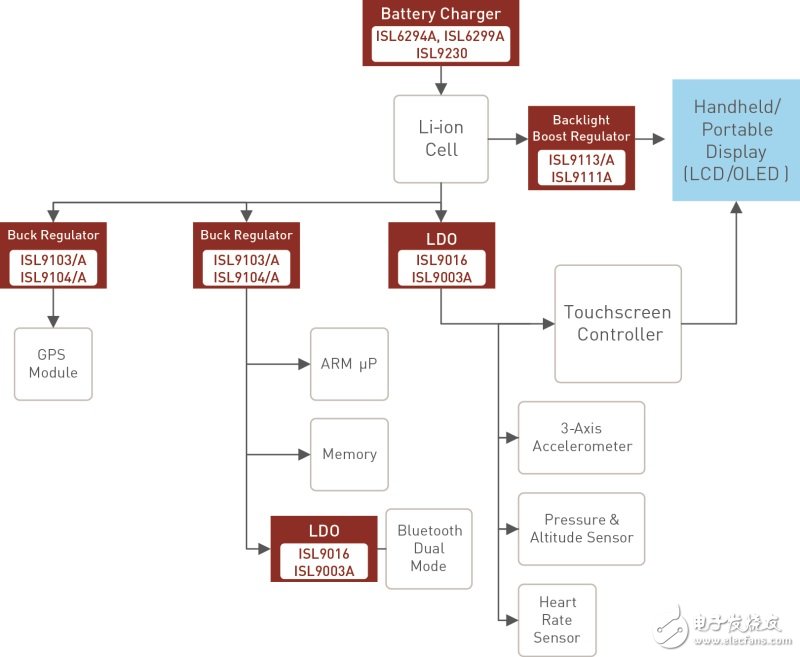 圖1:可穿戴設(shè)備典型電源解決方案系統(tǒng)框圖
