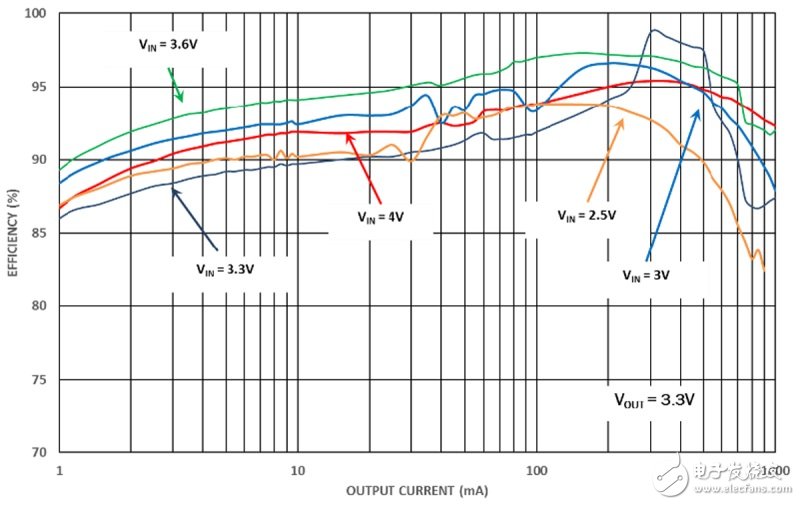 首先,我們將討論升壓-降壓穩(wěn)壓器如何為可穿戴系統(tǒng)增加價值。對于需要約3.3V~3.6V輸入電壓的應用,升壓-降壓穩(wěn)壓器可高效地使用電壓范圍為4.375V~2.5V的廣泛新型化學電池。升壓-降壓穩(wěn)壓器在電池電壓(Vbat)為2.5V~3V時處于純升壓模式,然后在Vin≥3V和<3.9V時處于升壓-降壓模式,最后在Vbat =3.9V-4.5V時處于純降壓模式。
