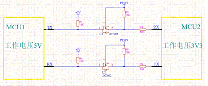 RX為0V。該電路從MCU1到MCU2方向,數(shù)據(jù)傳輸,達(dá)到了電平轉(zhuǎn)換的效果。