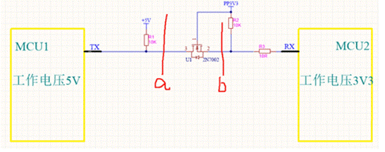 看圖3,如果沿著a、b兩條線,將電路切斷。那么MCU1的TX引腳被上拉為5V,MCU2的RX引腳也被上拉為3.3V。2N7002的S、D引腳(對應(yīng)圖3中的2、3引腳)截止就相當(dāng)于a、b兩條線,將電路切斷。也就是說,此電路在2N7002截止的時候是可以做到,給兩個MCU引腳輸送對應(yīng)的工作電壓。