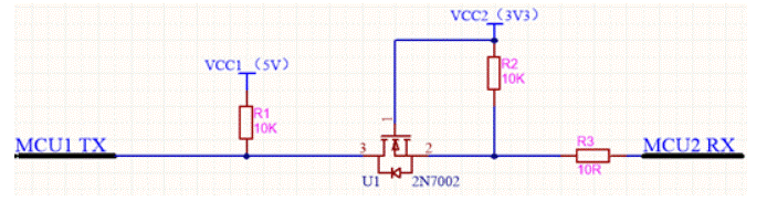 先說一說這個電路的用途:當(dāng)兩個MCU在不同的工作電壓下工作(如MCU1工作電壓5V;MCU2工作電壓3.3V),那么MCU1與MCU2之間怎樣進(jìn)行串口通信呢?很明顯是不能將對應(yīng)的TX、RX引腳直接相連的,否則可能造成較低工作電壓的MCU燒毀!