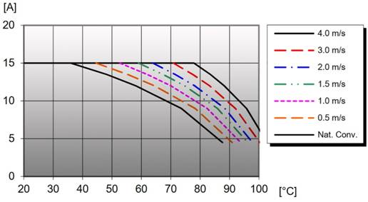 圖 2:圖 1 測試設(shè)置生成的降額曲線。(來源:Flex Power Modules部件 PKU4213D,開放式框架布置)