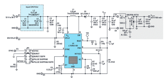 我們可以使用LT8362升壓轉(zhuǎn)換器構(gòu)建一個(gè)高性能電源,該轉(zhuǎn)換器采用60 V、2 A開關(guān),工作頻率最高可達(dá)2 MHz,且采用3 mm × 3 mm小型封裝。下面的電路基于標(biāo)準(zhǔn)的LT8362演示板 DC2628A, 其原理圖如圖1所示。