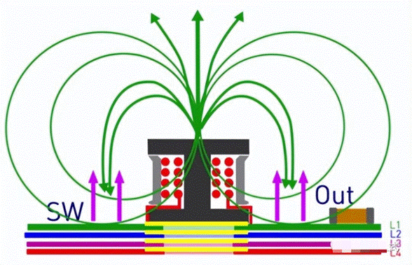 當(dāng)Boost升壓正常工作時(shí),電感中流過(guò)負(fù)載電流,形成回路。由于開關(guān)管的存在,電流是動(dòng)態(tài)變化的,由此可形成電感的磁感線,在導(dǎo)體的表面部分磁感線回形成封閉的磁回路,部分磁路會(huì)形成漏磁溢出到空氣中。如果電感底部沒有敷銅時(shí),從電感中溢出的磁感線會(huì)在整個(gè)電源系統(tǒng)中存在,使系統(tǒng)沒有相對(duì)安靜的空間,會(huì)造成EMI的性能下降。
