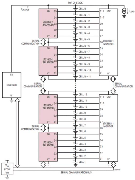當(dāng)應(yīng)用于串接式鋰離子電池的BMS系統(tǒng)時,LTC3300-1組成的電池組平衡器是系統(tǒng)中的關(guān)鍵部件,能夠和監(jiān)視器、充電器、微處理器或微控制器協(xié)同工作。圖4是LTC3300-1應(yīng)用于BMS系統(tǒng)的原理圖,電池組平衡器在系統(tǒng)中的作用是,針對某一個給定的失衡電池與相鄰的較大的電池組(其包含失衡電池)進行電荷轉(zhuǎn)移,以達到單電池和整個電池組的電壓或容量平衡。