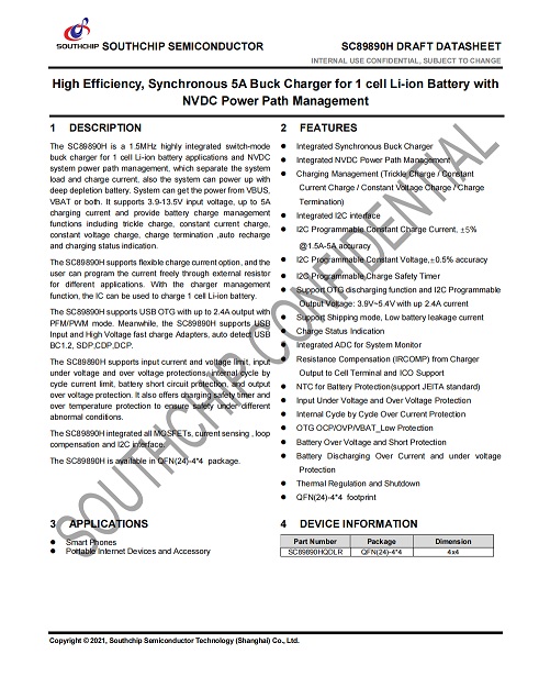 南芯SC89890H芯片支持3.9V至14V寬輸入電壓;支持BC1.2檢測(cè)及可調(diào)高壓適配器,同時(shí)具備適配器最大功率自動(dòng)跟蹤功能以及VINDPM支持電池電壓自動(dòng)跟蹤。