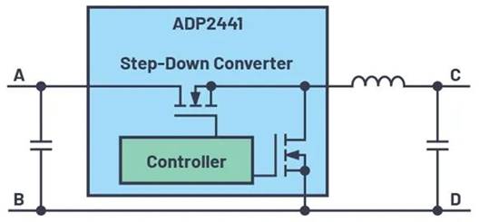圖1中未體現端子的噪聲特性。不同的開關穩(wěn)壓器拓撲在2端口網絡端子處具有不同的噪聲特性。圖2顯示適合工業(yè)應用的ADP2441通用降壓轉換器。它可以將24 V輸入電壓轉換為3.3V輸出電壓。采用這種拓撲時,可以看出,輸入側會產生脈沖電流,因此噪聲很大。當ADP2441上的高端開關導通時,電流流入端子A。當此開關關斷時,沒有電流流經節(jié)點A。但是,輸出端C的噪聲很小。其中,輸出路徑中的電感可確保輸出端沒有脈沖電流。