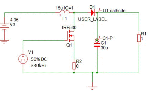 在圖 3中,升壓轉(zhuǎn)換器電源系統(tǒng)由經(jīng)典的 MOSFET-二極管-電感器組合表示。MOSFET 以 50% 的占空比進行開關,輸入電壓源 V3 設置為產(chǎn)生
