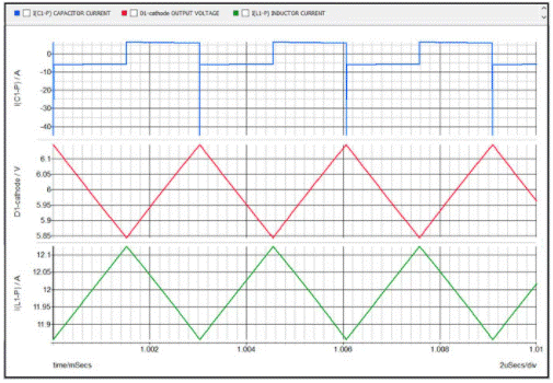 在相同的負載下,與降壓模式相比,相同的 LC 濾波器在升壓模式下必須更加努力地工作。在升壓情況下,電容器切換 6A 而不是 300mA 峰值,電感器承載