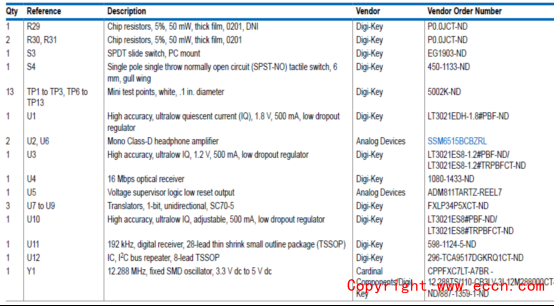 ADI公司的SSM6515是高度集成高效率超低功耗單聲道D類音頻放大器,具有很適合用于無線耳機的數(shù)字輸入.應用電路僅需要很少的外接元件,工作電壓從1.8 V (PVDD)低電源和1.2V到1.8V(IOVDD)電源.這些和1.8V信令能共享.器件能向16 Ω負載提供<1%總諧波失真+噪音(THD+N)的連續(xù)輸出功率85mW.器件具有2.57 μV rms噪音, 113 dB A加權信噪比和動態(tài)范圍, 30 mW, 1 kHz輸出32 Ω 負載的THD+N為0.003%,I2C控制有多達4引腳可選擇地址或單調(diào)的操作.有多種串行數(shù)據(jù)格式,TDM,I2S或左對齊從,PDM輸入從2.8224 MHz 到12.288 MHz. 支持取樣速率從8 kHz 到 768 kHz,具有靈活數(shù)字增益調(diào)整,具有可編角頻率的DC阻隔高通濾波器,高性能模式的典型空閑功率為1.55mW,低功耗模式以降低功耗,靈活的輸出增益限制器和剪裁技術,具有零數(shù)字輸入的自動降功耗特性,短路保護和雜音抑制器,用戶可選擇的超低EMI發(fā)送模式,加電復位(POR), 1.8 V PVDD電源,1.2 V 到1.8 V IOVDD電源,采用11凸0.984 mm × 1.444 mm, 0.35 mm間距WLCSP封裝.主要用在無線耳機,有源噪音抑制耳機,智能手機耳機揚聲器,助聽器和手持電子設備.本文介紹了SSM6515主要特性,功能框圖,典型應用電路圖以及評估板EVALSSM6515Z主要特性,電路圖,材料清單和PCB設計圖.