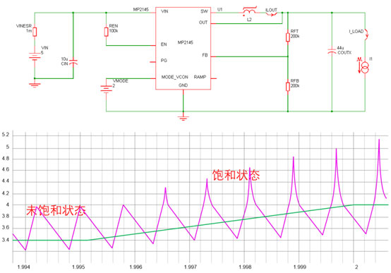 還是以MP2145為例,使用MPSmart仿真工具進(jìn)行仿真,從仿真波形可以知道,當(dāng)電感沒有飽和時(shí),電感電流是一個(gè)斜率一定的三角波,當(dāng)電感飽和時(shí)電感電流波形會(huì)有一個(gè)明顯畸變,這是由于飽和后感量降低造成的。