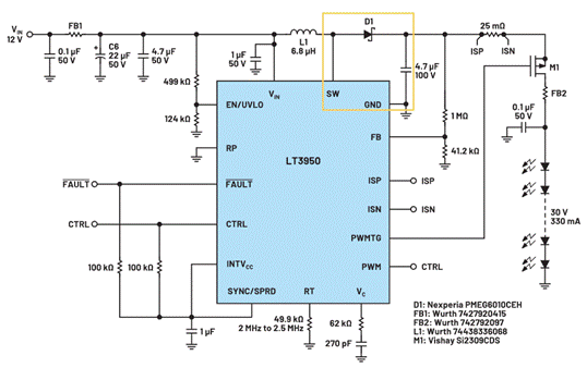 LED驅(qū)動(dòng)器具有簡單的PCB熱回路。這個(gè)熱回路(在圖3中突出顯示)只包含小型陶瓷輸出電容和尺寸相似的分立式續(xù)流二極管PMEG6010CEH。這些組件與LT3950