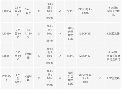 MHz和SSFM,能提供低輻射。EVAL-LT8357-AZ升壓控制器可以實(shí)現(xiàn)相似的性能。有關(guān)這些器件的完整輻射結(jié)果、原理圖和測試選項(xiàng),可以訪問analog.com,查看對應(yīng)的產(chǎn)品登錄頁面。表1列出了一個(gè)新的低EMI異步升壓和SEPIC轉(zhuǎn)換器系列。單芯片IC和控制器IC結(jié)構(gòu)簡單、成本低,采用多種拓?fù),具有大功率功能和低輻射,因此非常?shí)用。當(dāng)超低輻射成為首要的要求時(shí),也可以使用高電流Silent