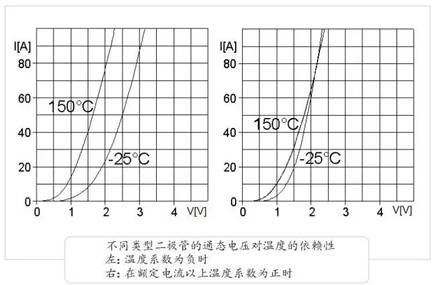 判斷一個(gè)二極管是否適合并聯(lián)的重要參數(shù)是其通態(tài)電壓對(duì)溫度的依賴性。如果通態(tài)電壓隨溫度的增加而下降,則它具有負(fù)的溫度系數(shù)。對(duì)于損耗來說,這是一個(gè)優(yōu)點(diǎn)。