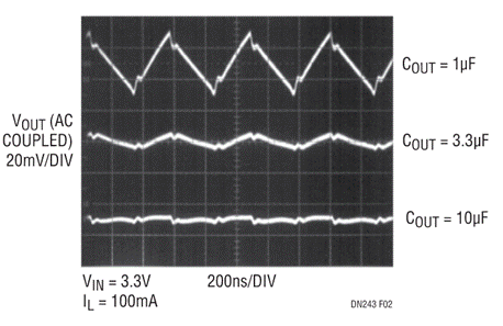 即使采用小型輸出電容器,器件的2MHz振蕩頻率也可允許低輸出紋波,圖2給出了LTC3200-5采用不同值的輸出電容器支持100mA負(fù)載電流時的輸出紋波情況。