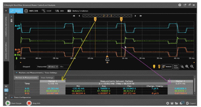 如下圖所示,我們利用APS電源拉載脈沖電流,同時(shí)利用其200KSa/s(18bit)高速采樣能力監(jiān)測(cè)電池的端電壓,可以看到其變化呈現(xiàn)3個(gè)不同階段。