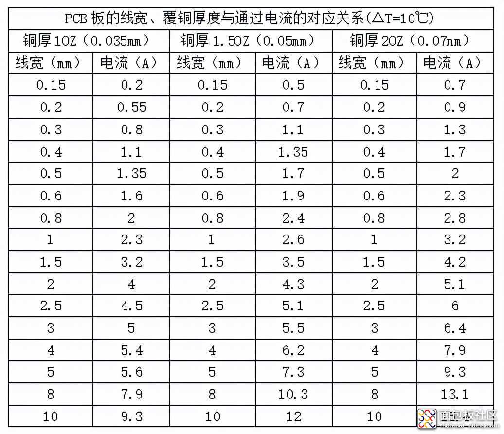 附上溫升10℃時(shí),PCB板的線寬、覆銅厚度與通過(guò)電流的對(duì)應(yīng)關(guān)系供參考。
